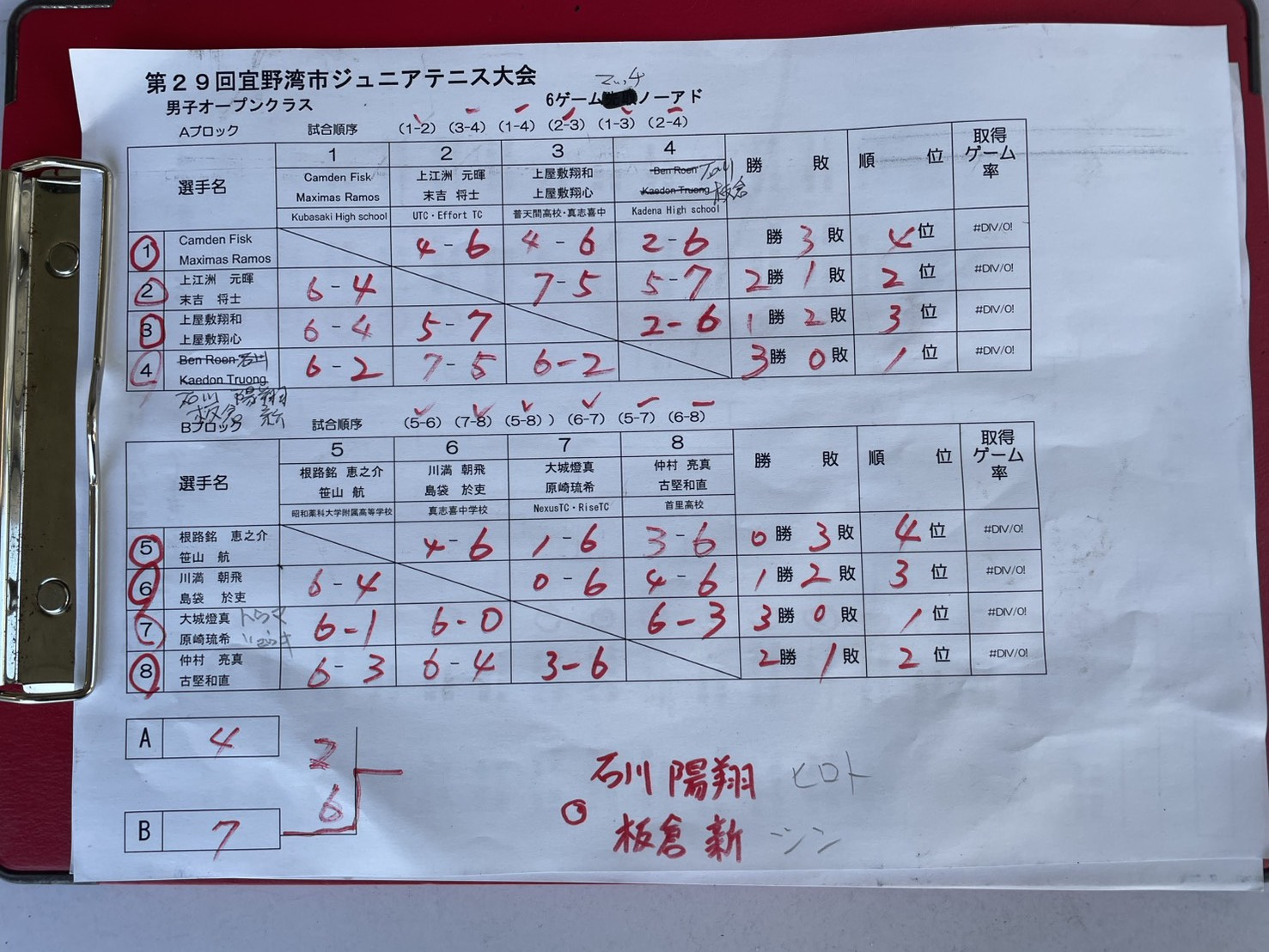 Home大会要項 結果 男子:第29回宜野湾市ジュニアテニス大会 ginowan-tennis 2025年11月9日 大会要項 コメントはまだありません 男子オープンクラス 優勝 大城 燈真(NexusTC)/原崎 琉希(RiseTC) 準優勝 石川 陽翔/板倉 新 男子ビギナークラス 優勝 川俣 優翔(沖縄インターナショナルスクール)/次呂久 世恭(Kテニス) 準優勝 宮田 松晴(ヒーローTS)/川俣 陽翔(沖縄インターナショナルスクール) Tweet Pin It